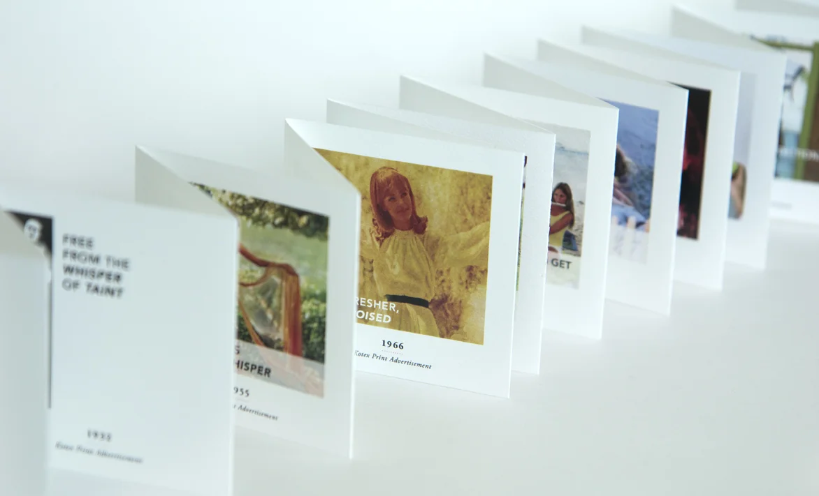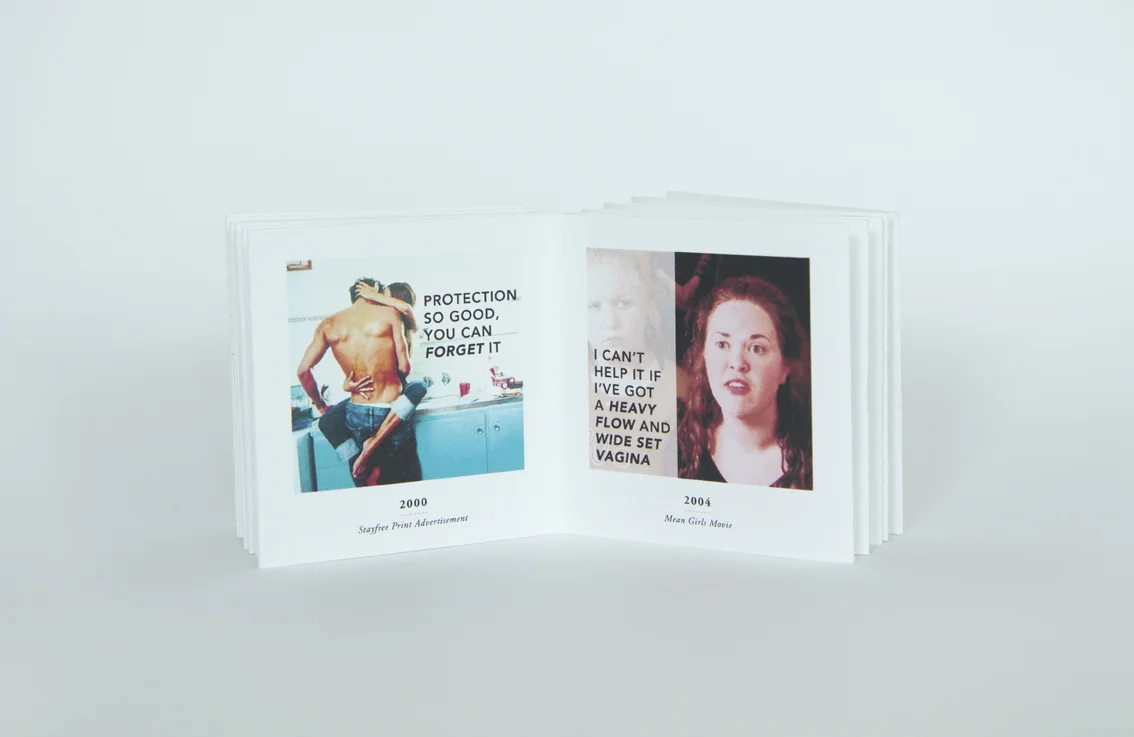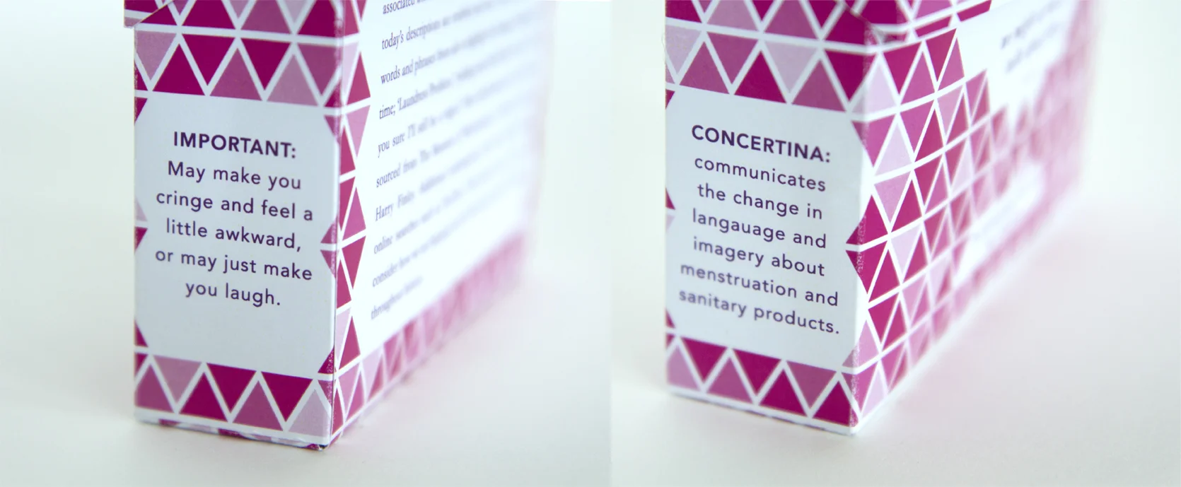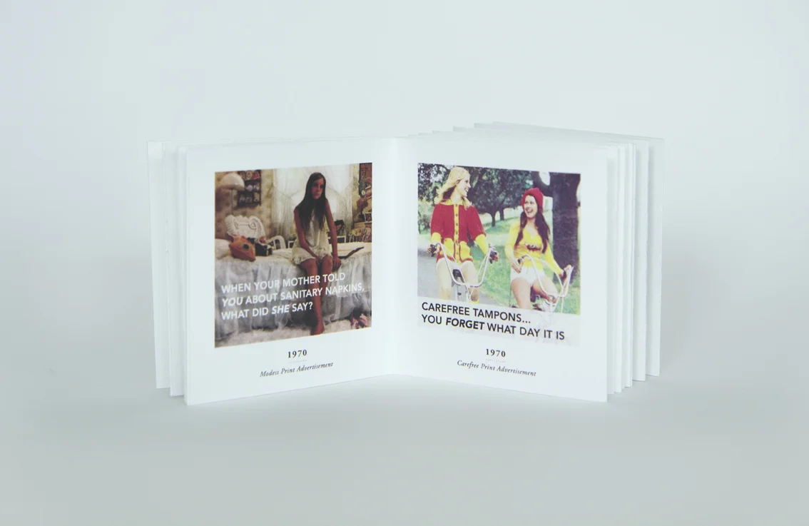 This concertina timeline communicates the change in language and imagery about menstruation and sanitary products from 1921-2014. I gathered images and their complimentary texts from advertisements and combined them in a way to reveal the awkward language associated with this topic. Where descriptions used to be more poetic, today’s descriptions are truthful and real. I have selected particular words and phrases from ads to highlight the change in language over time; ‘Laundress Problem’, ‘yielding mass like fluffy cotton’, and ‘Are you sure I’ll still be a virgin?’. Most advertisements were primarily sourced from The Museum of Menstruation, a website curated by Harry Finley. Additional contemporary ads were found through online searches such as YouTube. This project aims to make you consider how we use language around this topic and how it’s differed throughout history.