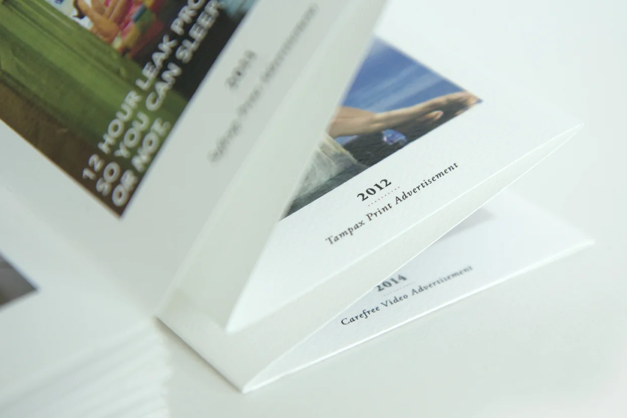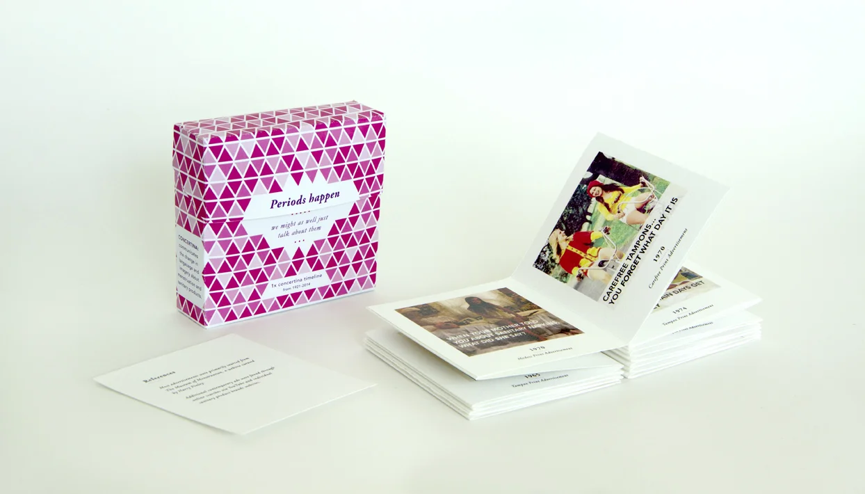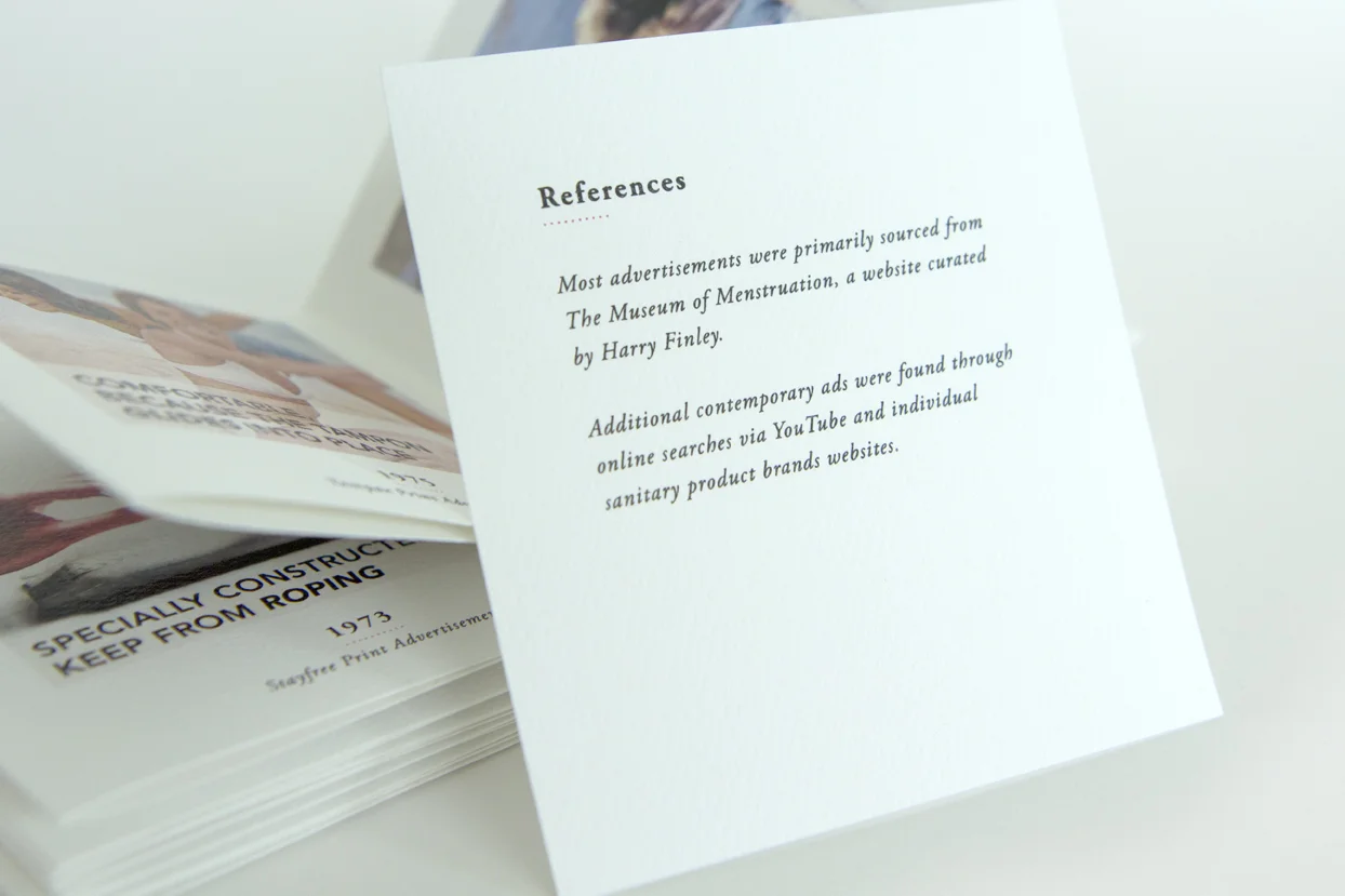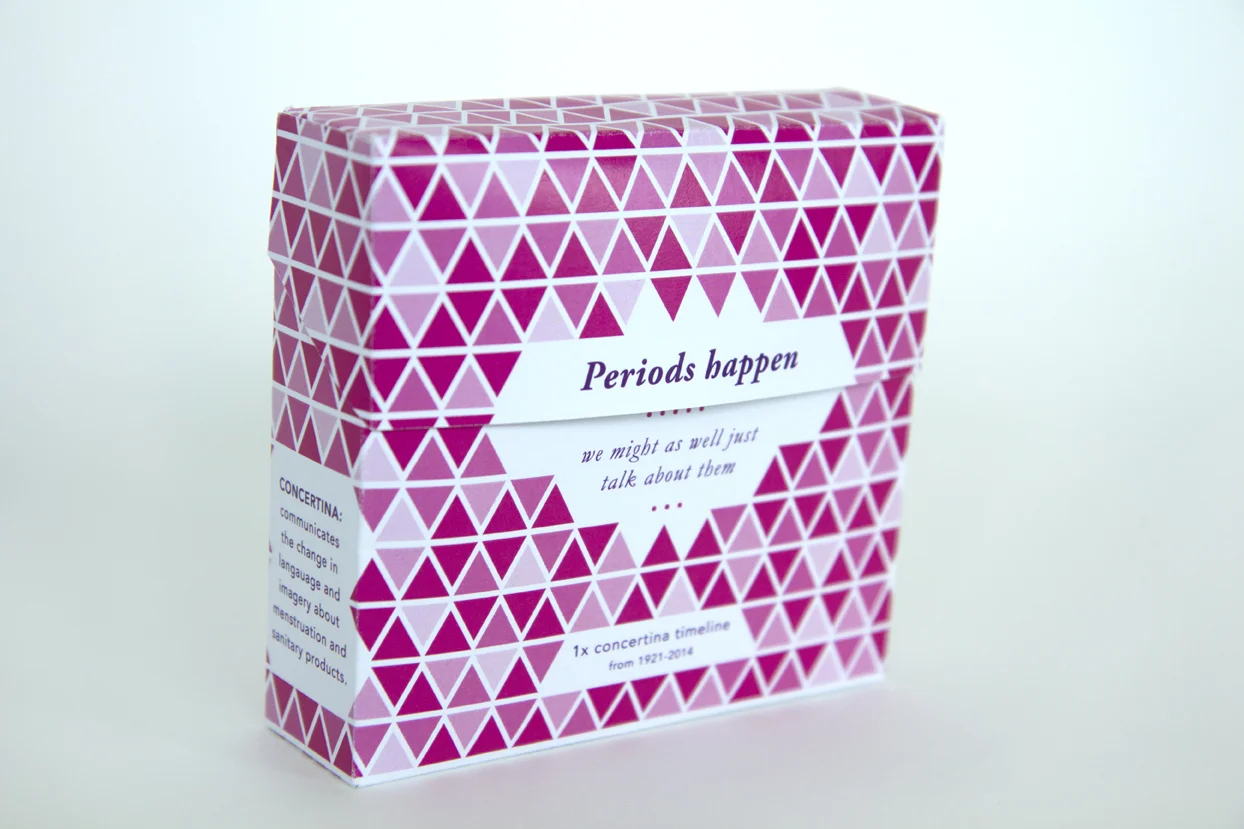 This concertina timeline communicates the change in language and imagery about menstruation and sanitary products from 1921-2014. I gathered images and their complimentary texts from advertisements and combined them in a way to reveal the awkward language associated with this topic. Where descriptions used to be more poetic, today’s descriptions are truthful and real. I have selected particular words and phrases from ads to highlight the change in language over time; ‘Laundress Problem’, ‘yielding mass like fluffy cotton’, and ‘Are you sure I’ll still be a virgin?’. Most advertisements were primarily sourced from The Museum of Menstruation, a website curated by Harry Finley. Additional contemporary ads were found through online searches such as YouTube. This project aims to make you consider how we use language around this topic and how it’s differed throughout history.